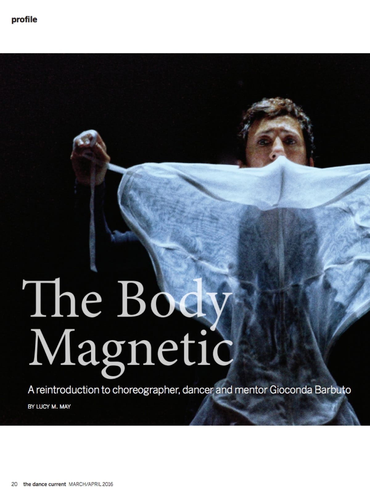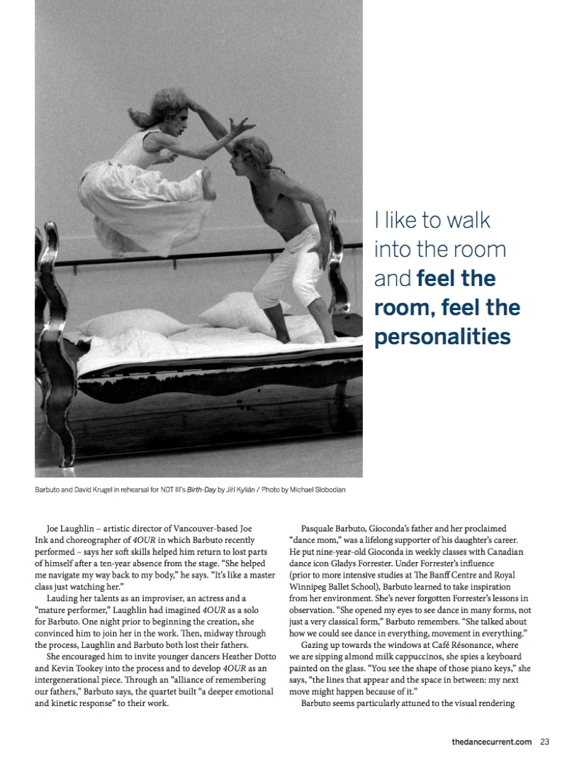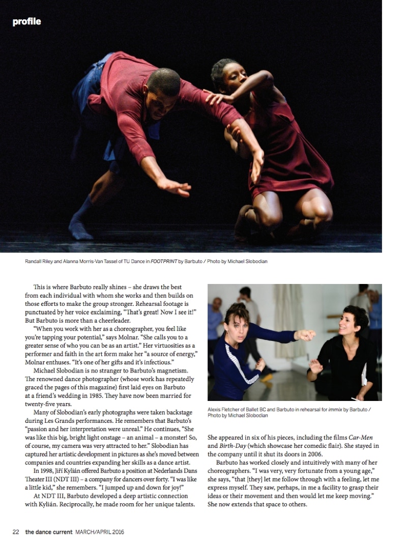Since emerging as an independent artist, Barbuto has made many notable contributions to the Canadian contemporary dance milieu. She performed frequently with Margie Gillis, most recently in M.Body.7; co-created and performed Lifelines with Emily Molnar; and self-produced the solo Respiro. Most recently, she collaborated with Joe Laughlin on his new quartet 4OUR, with a successful tour of Atlantic Canada.