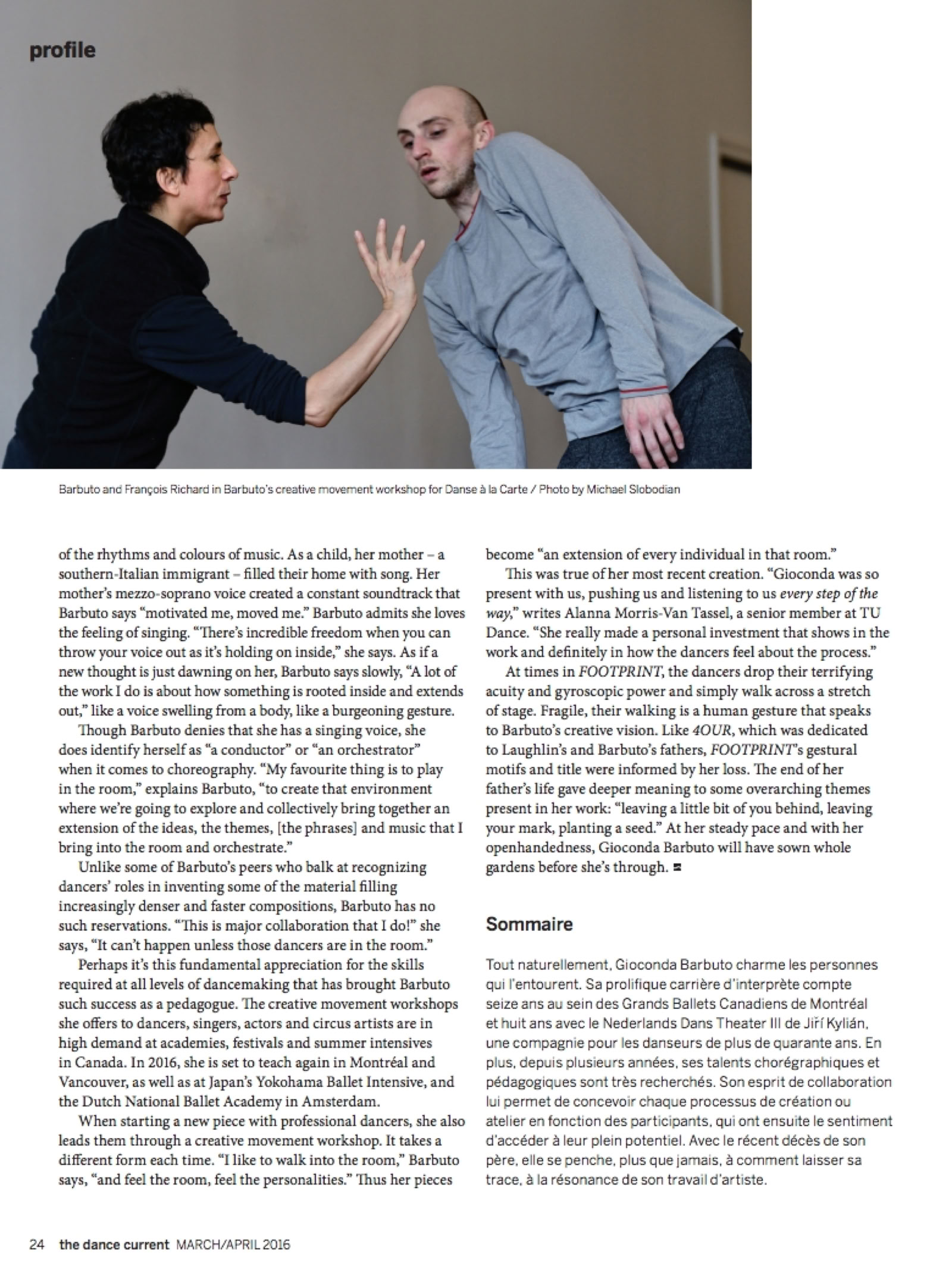 Since emerging as an independent artist, Barbuto has made many notable contributions to the Canadian contemporary dance milieu. She performed frequently with Margie Gillis, most recently in M.Body.7; co-created and performed Lifelines with Emily Molnar; and self-produced the solo Respiro. Most recently, she collaborated with Joe Laughlin on his new quartet 4OUR, with a successful tour of Atlantic Canada.